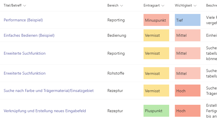 Sie lassen sich für jegliche Arten von Listen einsetzen (z.B. im Screenshot als Lasten- Pflichtenauflistung in einem Softwareprojekt) Wir oder Kunden von uns schätzen z.B. die Möglichkeit, dass alle relevanten Personen darauf zugreifen und bei entsprechenden Rechten Einträge editieren und hinzufügen können (natürlich mehrere Personen gleichzeitig). Auch, dass man in Feldern mit vorgegebenen Werten mit automatisch zugewiesenen Farben arbeiten kann, die übersichtliche und automatisch generierte Bearbeitungsmaske, oder die Schnellbearbeitung in der Rasteransicht.