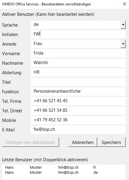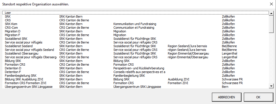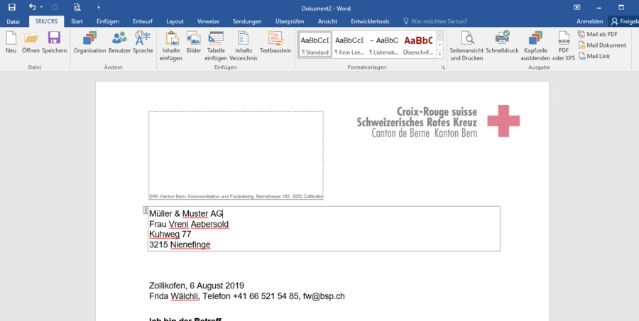 Darin zeigte sich, dass für das SRK folgende Lösung optimal ist: Die alten Vorlagen wurden durch insgesamt 12 komplett neu aufgebaute Dokumente ersetzt. Wir haben dazu ein kundenspezifisches Menuband in Word entwickelt, welches individuelle Funktionen wie Organisation (Logos uns Adressen der regionalen Aussenstellen) Benutzerdaten oder die Sprache der Vorlagen steuert. Jeder Benutzer ist einzeln anwählbar und kann selbständig verwaltet werden. Die Vorlage erkennt die benutzerspezifischen Daten, das gewählte Logo sowie die gewünschte Sprache und füllt die relevanten Felder ab.