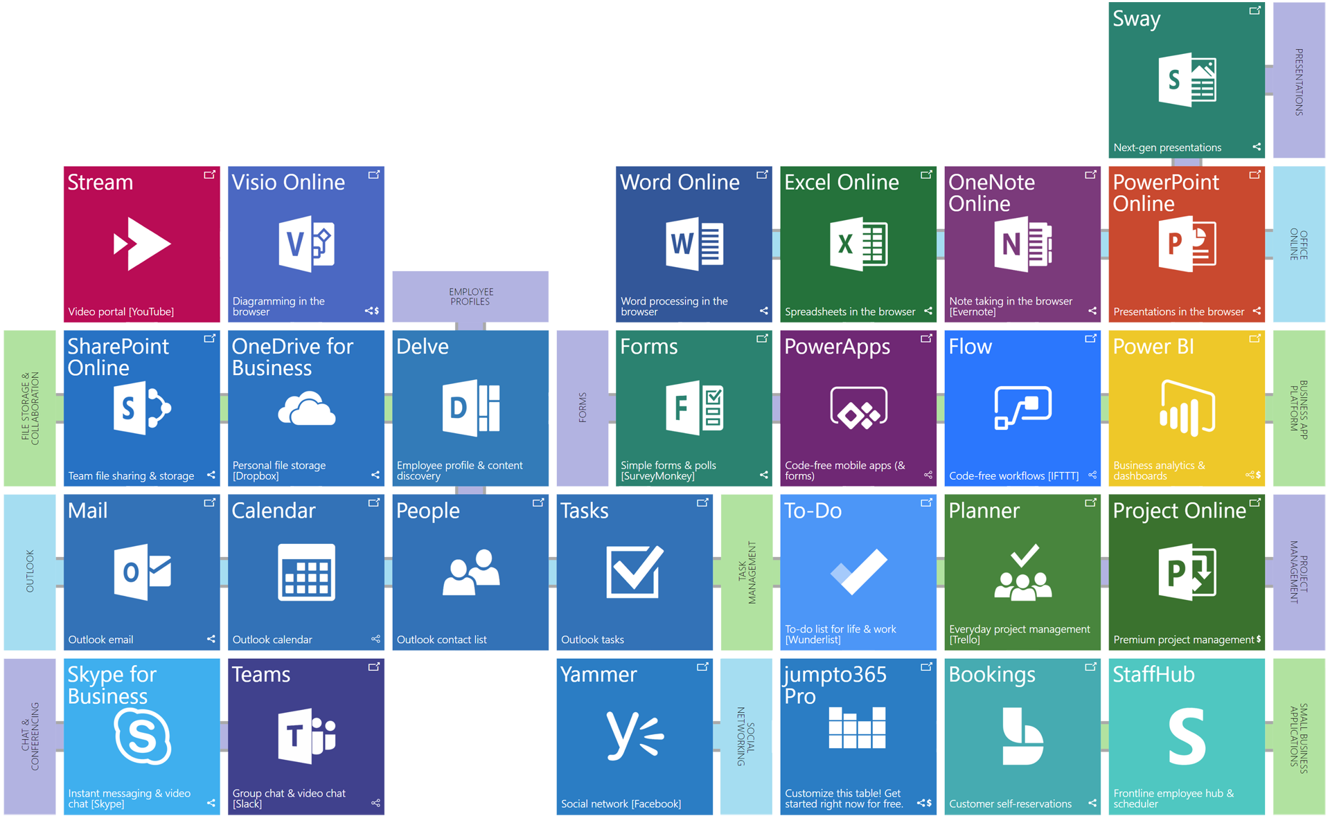 - Die ganzen Office Programme (Word, Excel, Outlook, PowerPoint, OneNote, usw.) online oder als Desktop-Anwendung
