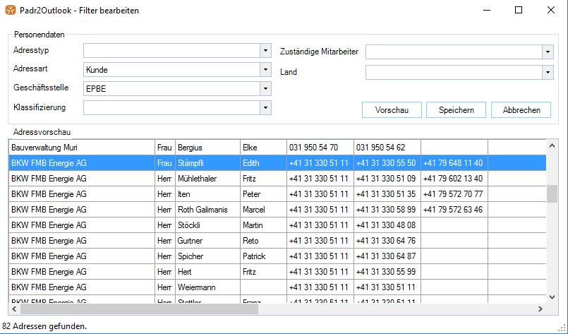 - Nach initialem setzen von Filterkriterien (z.Bsp: Alle Kunden und Lieferanten aus der Verkaufsregion Bern) werden alle Kontakte vollautomatisch und im Hintergrund in Microsoft Outlook und auf das Natel synchronisiert