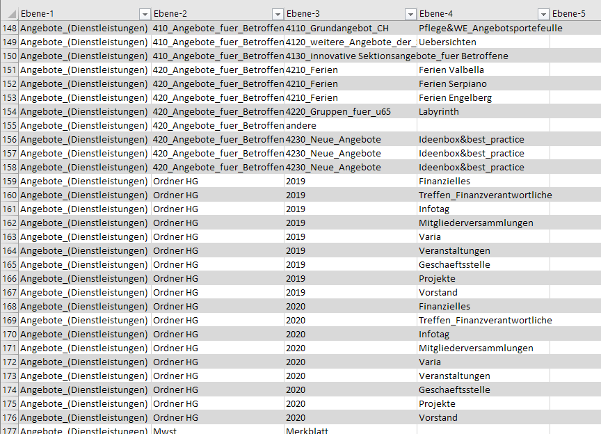 Ziel dieses achtmonatigen Projekts war, die zentrale Dateiablage von Alzheimer Schweiz neu zu erstellen. Die alte Ablage war über 15 Jahre "konzeptlos" gewachsen. Gemäss einer ersten Analyse 2018 umfasste diese Ablage insgesamt 380'890 Files in 54'707 Ordnern bei einer Datenmenge von ca. 900 GByte. Durch die tiefe Strukturierung (bis 19 Ebenen) und den beliebigen Ausbau ohne Konzept und Konventionen, war es für neue Mitarbeitende teilweise fast nicht möglich, gezielt etwas zu finden. Zudem funktionierte die Suche über den Dateiexplorer so langsam, dass auch dies keine Option zum Finden war.